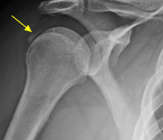 Rotator cuff tear with pain and weakness on exam. There may be catching with overhead movements. This condition is best seen with x-rays of the shoulder. Sometimes an MRI is ordered to rule out a rotator cuff tear.